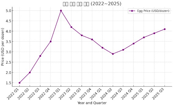 egg_price_trend.png" alt="미국 달걀 가격 변동 그래프" style="max-width: 100%; height: auto; border: 1px solid #ddd; border-radius: 5px; box-shadow: 2px 2px 10px rgba(0,0,0,0.1);">가격 데이터에 따르면, 2022년 초반 12개들이 한 판 기준 약 1.5달러였던 달걀 가격이 2023년 초에는 5달러까지 치솟았습니다. 이후 2024년에는 다소 안정되었으나, 2025년 초반 다시 상승세를 보이고 있습니다. 이는 조류독감 확산과 공급망 문제가 여전히 해결되지 않았음을 의미합니다.
